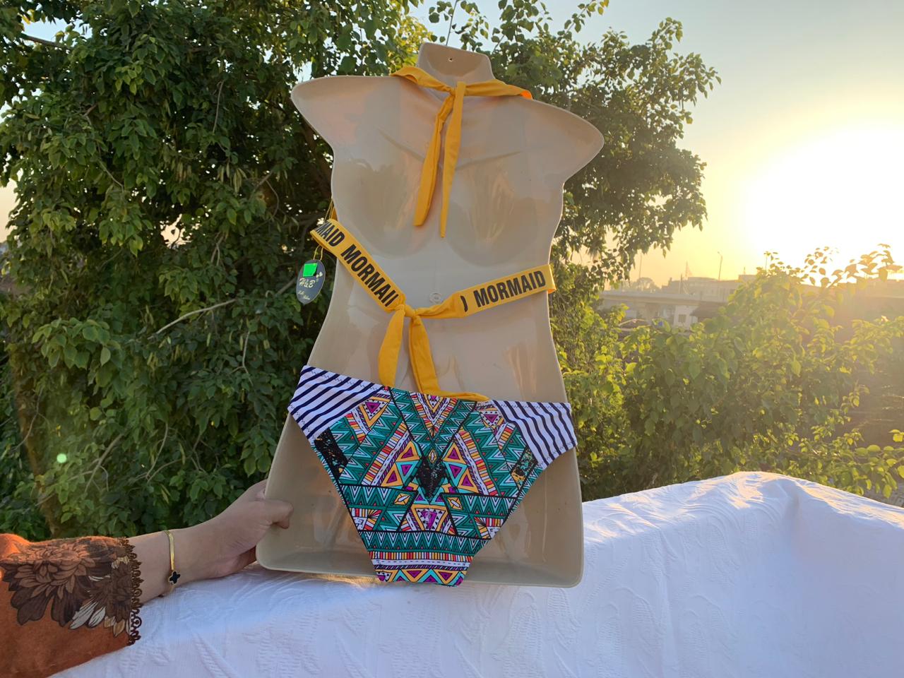 Designed for comfort and confidence, the top includes a supportive underband with “MORMAID” branding and adjustable ties for a secure fit. The stretchy bikini bottom offers full comfort with eye-catching multicolor patterns.