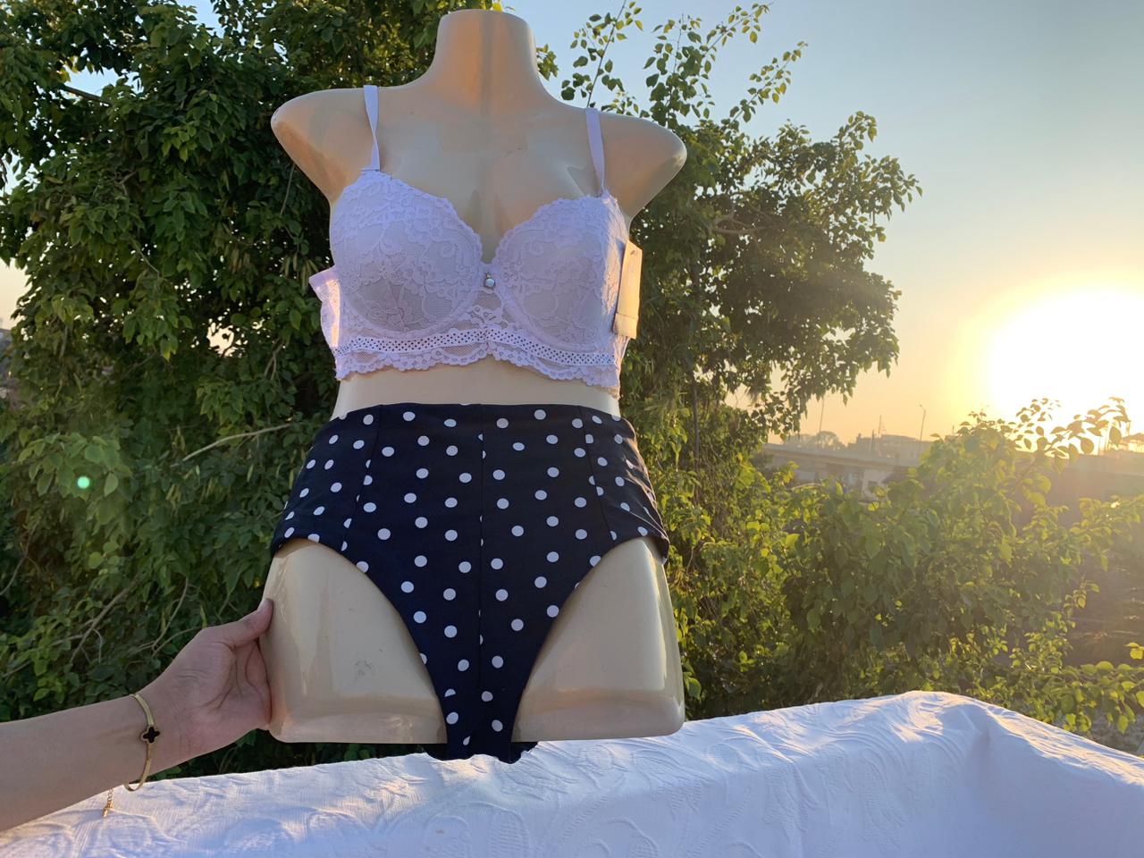A cute and comfortable lingerie combo featuring a delicate white lace bra paired with a high-waist black panty with white polka dots.